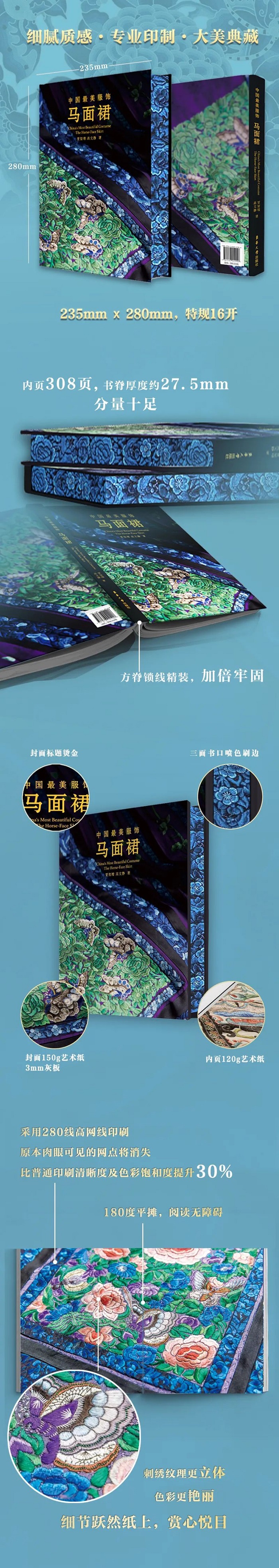 《中国最美服饰·马面裙》为特规16开,尺寸为235mm*280mm,大开本更方便读者研究、欣赏。内页约为308,书脊厚度约27.5mm,采用方脊锁线精装,加倍牢固。封面标题烫金印刷,看上去更有质感。本书封面采用的是150g艺术纸,内页采用的是120g艺术纸,与上海雅昌艺术印刷有限公司合作,采用高清印刷技术,纹理极为清晰可见,更有立体逼真效果,还可以180度平摊阅读,实为研究、收藏的重量级经典好书!