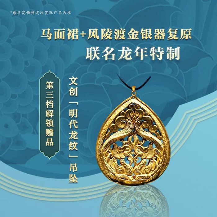 《中国最美服饰·马面裙》项目众筹金额达2w,即加赠龙纹藏书票;众筹金额达6w,加赠蝶恋花国风胶带;众筹金额达10w,另外加赠“马面裙+风陵渡金银器复原”联名龙年特制文创——“明代龙纹吊坠”……更多解锁权益,敬请关注后续项目更新!(*以页面显示的众筹金额为准)