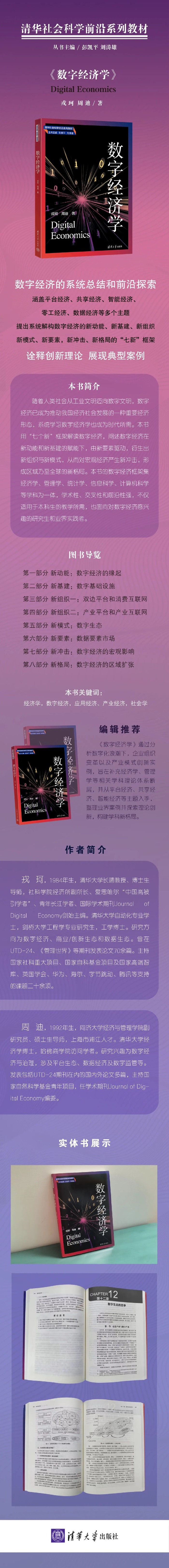 清华大学《数字经济学》是清华社会科学前沿系列教材之一。作者是清华大学长聘教授戎珂和同济大学副研究员周迪。该教材对数字经济学科理论知识和行业实践作出了系统性、前沿性的梳理、研究和总结。