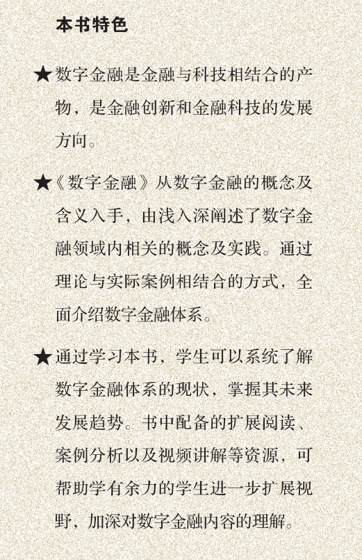 本书共分十一章,内容包括:数字金融概述,互联网金融,第三方支付等。每章配有扩展阅读及分析,帮助读者更全面深入理解。本书以了解数字金融发展现状、掌握领域未来发展趋势为核心,内容丰富、通俗易懂,案例贴近实际,便于学习与借鉴。