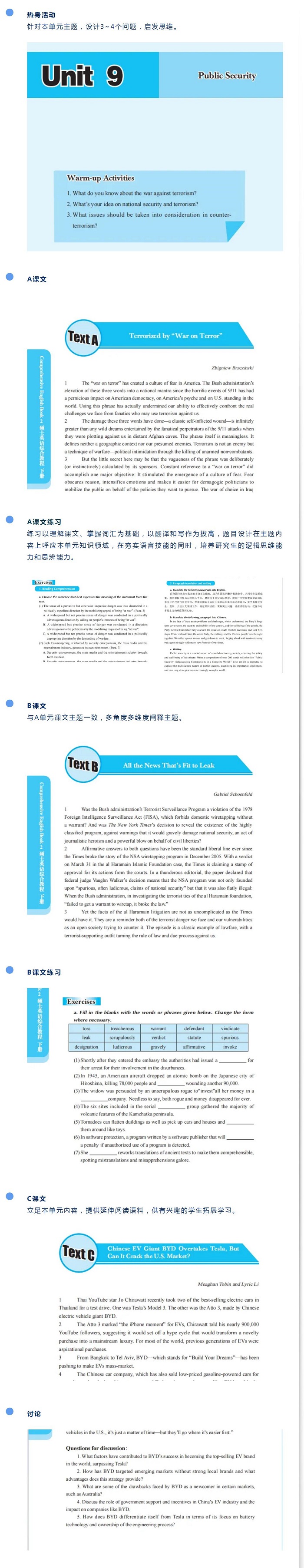每单元课文分为A、B、C三篇,其中A篇包括课文、词汇和练习,用于教师课堂教学;B篇包括课文与练习,用于研究生自主学习;C篇为扩展阅读,用于提高研究生的英语阅读量。A、B、C课文形成一个相对完整的知识结构。