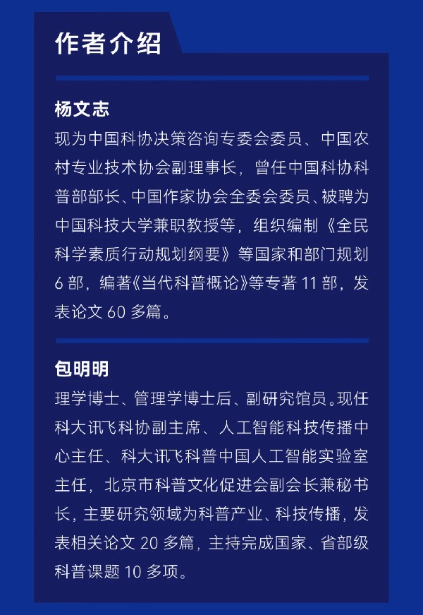 我们希望无论是科普工作者、教育者还是对科普充满好奇的普通读者都能从这本书中汲取灵感和智慧。因为书中不仅提供了实用的科普创作方法和技巧,更以其独特的视角和前瞻性的思考展现了我们走向一个更加科学、文明、进步的科普未来的愿景。