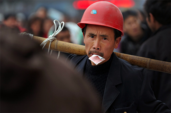 2010年2月5日,春运高峰期的成都北站,一位肩挑行李、头戴安全帽、嘴上衔着火车票的农民工准备踏上返乡的列车。