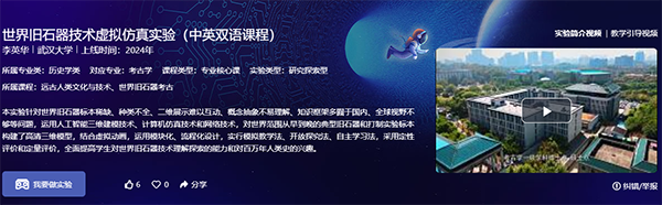 世界旧石器技术虚拟仿真实验(中英双语课程)已于2024年在国家虚拟仿真实验教学共享平台上线,学习者可在该平台注册学习。网址链接:https://www.ilab-x.com/details/page?id=12060。