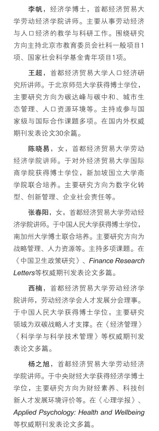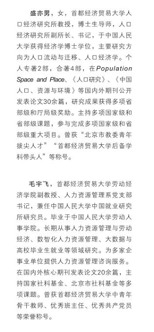 本书各章的编写人员由首都经济贸易大学劳动经济学院长期从事人口学、人力资源管理与人才学教学与科学研究的教师团队组成。每一章的编写人员尽量融汇自己的教学心得和研究成果,以确保本书的质量和水平。