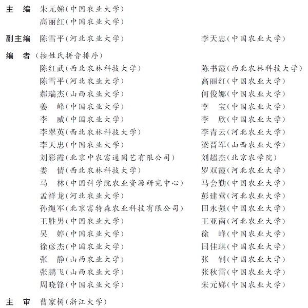朱元娣 中国农业大学园艺学院教授,博士生导师。科研聚焦果树种质创新与高效栽培、果树种苗繁育技术开发与标准化生产,重点研究柱型苹果遗传资源的挖掘利用、老北京梨文化遗产资源的保护利用以及果树种质脱毒与种苗繁育技术等内容,先后获得北京市科学技术奖和神农中华农业科技奖。主编普通高等教育农业农村部“十三五”规划教材《园艺通论》(第5版)和农业农村部新型职业农民培训教材《苹果规模生产与果园经营》,参编面向21世纪课程教材《园艺植物栽培学实验指导》、教育部“一村一名大学生计划”教材《园艺基础》(第2版)、开放教育融媒体教材《园艺学概论》(第2版)等多部著作。