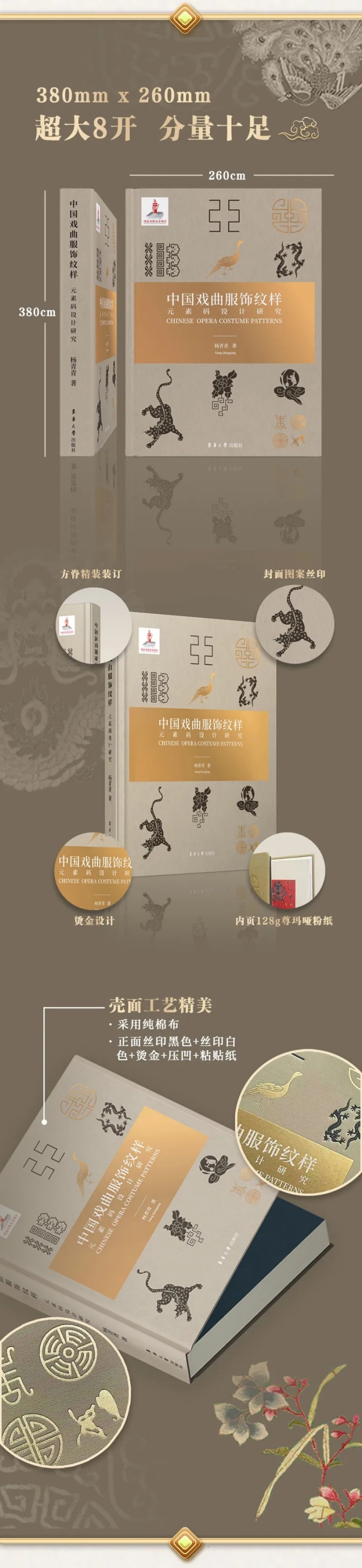 跨越4000年的戏曲服饰纹样生成史、328页,超大8开全彩精装、1000余张高清纹样视觉盛宴、30余种戏曲服饰样式的纹样生成、100余种戏曲纹样的当代设计实例……