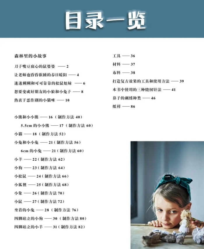 本书展示了一系列的古董小动物玩偶,书中所介绍的毛绒动物都是微型的,长度约10厘米(4英寸),可以放在手掌上把玩,也可以与其他玩偶及微缩场景搭配。本书介绍了一些易于实现古董风格外观的技术,作品别具一格。书后还附赠了1:1纸样,读者可自行制作。