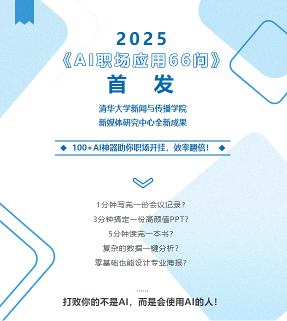 《AI职场应用66问》携超全AI工具清单来了!DeepSeek、ChatGPT、Midjourney…100+工具,60多个应用场景,覆盖文本、图片、音乐、视频、虚拟数字人全场景,职场难题一键解决,效率直接拉满。《AI职场应用66问》不仅是工具清单,更涵盖60+个实战场景解决方案,提升工作效率,激发创意灵感,优化职业决策,解锁100+AI神器。