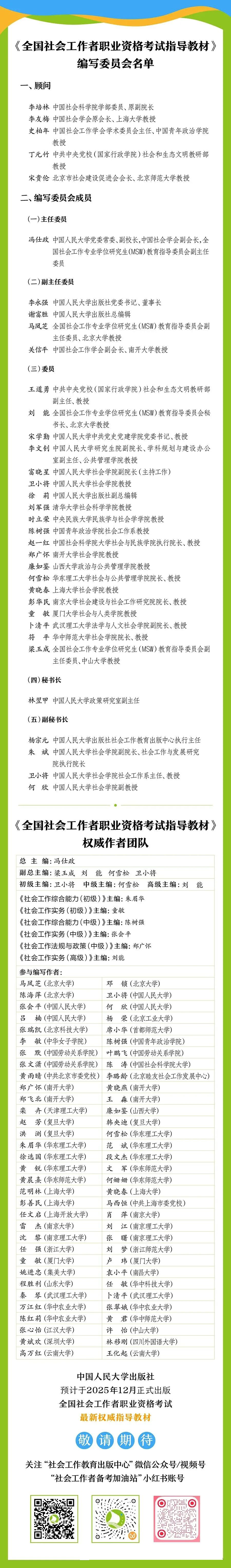 2025年12月,中国人民大学出版社将隆重推出《全国社会工作者职业资格考试指导教材》。
