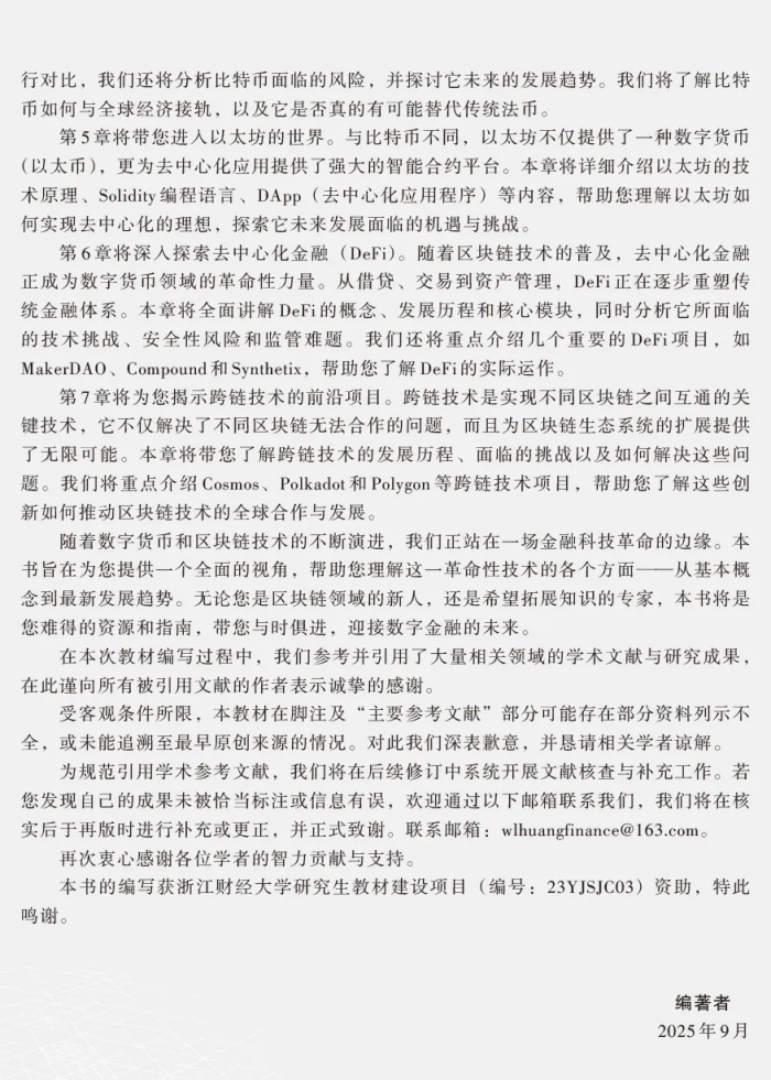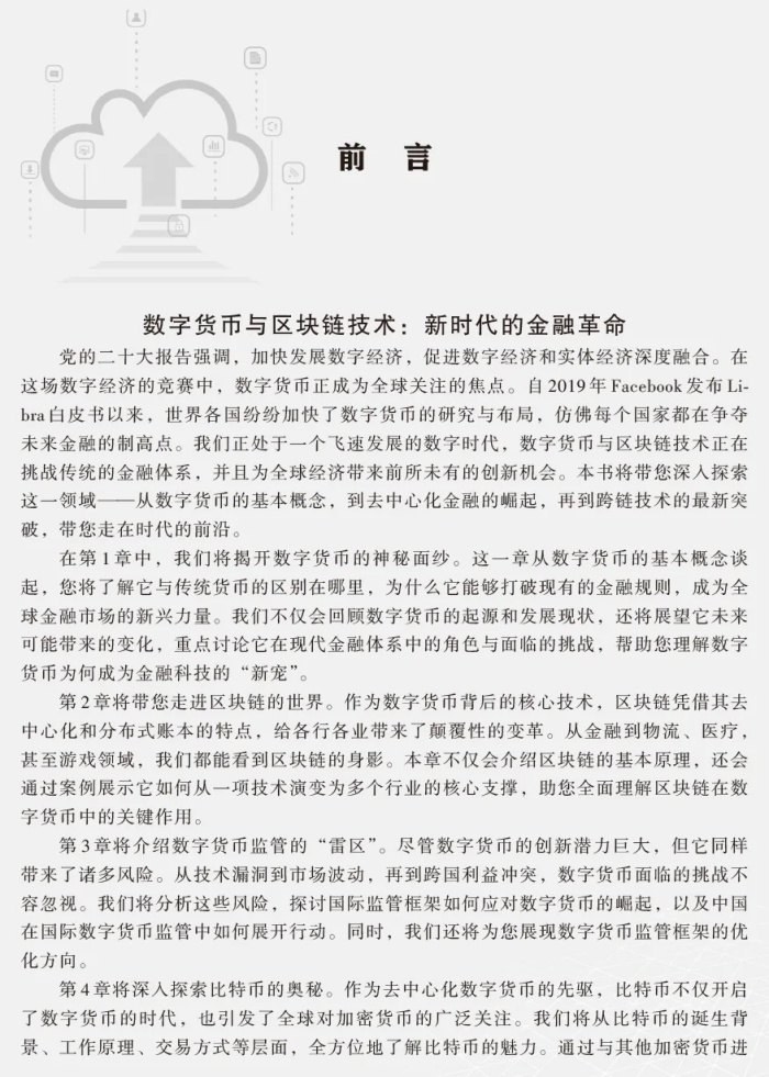 我们正身处一场由数字货币与区块链技术驱动的金融体系深刻变革之中。本书紧扣这一趋势,系统梳理从数字货币基础、区块链原理,到比特币运行机制、以太坊智能合约生态,再到去中心化金融(DeFi)与跨链技术的前沿进展,并深入剖析行业监管与风险挑战。通过理论与实例结合,本书不仅构建起完整的知识框架,更带你洞察技术背后的金融逻辑。无论你是初学者还是从业者,本书都将助你系统把握数字货币的核心脉络,真正理解这场数字革命,深入理解区块链技术在金融领域的应用。