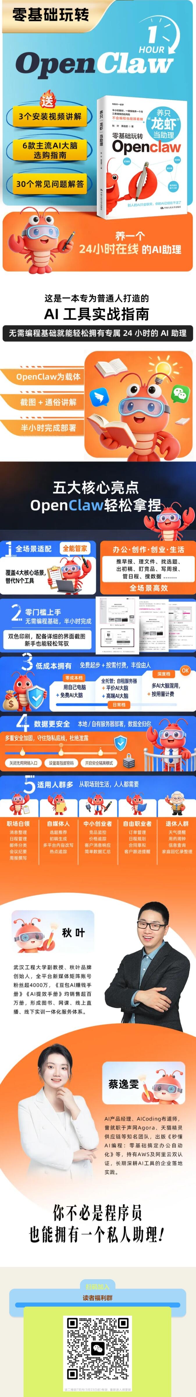 这是一本专为普通人打造的AI工具实战指南,零编程基础也能轻松拥有24小时专属AI助理。书中以开源工具OpenClaw为载体,避开复杂技术术语,通过分步骤截图+通俗讲解,带读者半小时完成部署,快速连接飞书、钉钉、企业微信等常用工具。