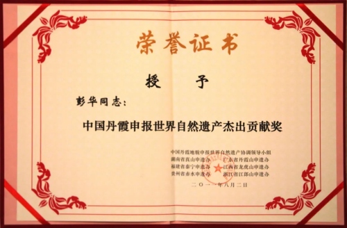 2011年8月,中国丹霞地貌申报世界自然遗产协调领导小组协同湖南省崀山申遗办、广东省丹霞山申遗办、福建省泰宁申遗办、江西省龙虎山申遗办、贵州省赤水申遗办、浙江省江郎山申遗办,共同授予彭华“中国丹霞申报世界自然遗产杰出贡献奖”