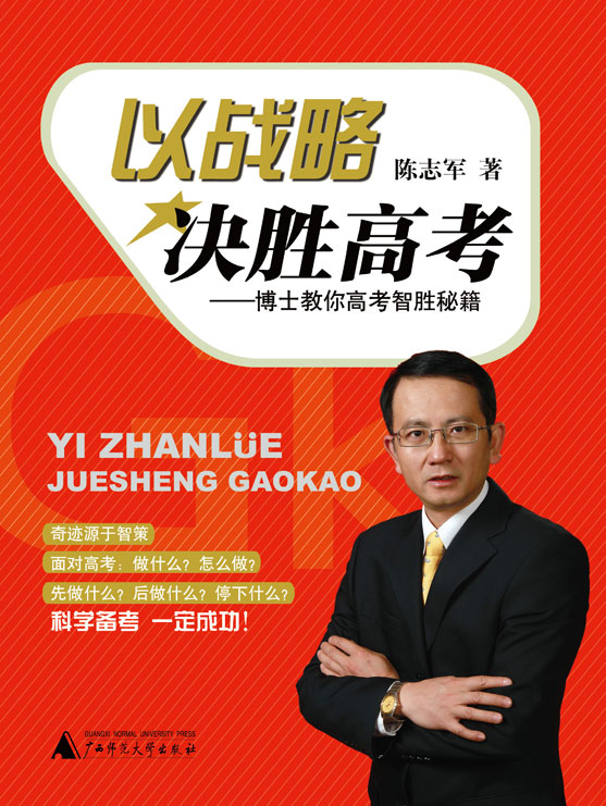 书名:《以战略决胜高考——博士教你高考智胜秘籍》 ISBN:978-7-5495-3065-6 作者:陈志军 定价:¥58.00 出版社:广西师范大学出版社有限责任公司 出版日期:2012-12-01 内容简介: 本书分为引导篇、认识篇、考生篇和家长篇。引导篇帮助考生带着目的或问题、家长带着责任或期望进行深入阅读。认识篇一方面帮助考生从战略角度重新认识高考,使考生对高考有更深刻、更全面的认识,把握高考全局,凭策略智取高考,另一方面指导考生全面剖析自己,准确把握自己的高考现状并通过以上认识并查找差距,考生做好自己对高考的规划。考生篇从战略角度指导考生提升高考考试能力,以“战略思维+细节管理”为指导思想,以“策略+方法”安排好每一轮复习,并对考生进行心理、生理方面以及考试技术方面的训练。家长篇指导家长做好孩子高考的辅助角色,成为孩子高考的坚实后盾。 本书附赠小册子,收录了从《以战略决胜考高》中提炼出的高考锦囊108条,从操作角度指导考生进行高考复习、参加高考,尤其适合高三下学期使用。考生在用这些锦囊升华自己的高考思想时,可以回顾正文,因为正文是按系统编纂的,有助于考生加深对高考锦囊的理解。 作者简介: 陈志军,北京大学数学学院概率统计专业学士、应用数理统计硕士;武汉大学经济学院经济学博士。1980年和1983年,广西贺州市中考状元、高考理科状元;1987年获免试推荐,就读北京大学硕士。初三自学完成高中数学课程,被特批以一名初中生的身份参加高三程度的广西全区高中数学竞赛并获奖。指导女儿采用“凭策略智取高考”的新思想参加2012年高考,凭“战略思维+细节管理”使她高考实力得以大幅提升。 来源:广西师范大学出版社