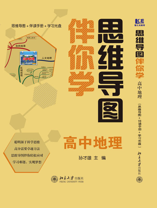 书名:《思维导图伴你学——高中地理》 ISBN:978-7-301-20970-7 作者:孙才雄 定价:¥68.00 出版社:北京大学出版社 出版日期:2012-12-08 内容简介: 思维导图学习法系列图书,是以新课标要求为前提,组织初中和高中一线名师和专家历时两年多编写而成。它是以思维导图为工具,以放射性思维为基础,以帮助学生开发左右脑潜能为目的的一种简单、高效的学习方法。 本书以"导图+图书+光盘"三位一体的形式组成,打破了传统图书的单一模式,与以往教辅图书相比,无论是形式还是内容都有较大的突破。 来源:北京大学出版社