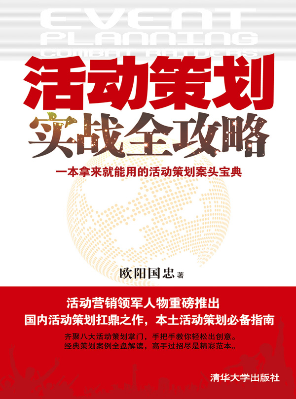 书名:《活动策划实战全攻略》 ISBN:9787302323815 作者:欧阳国忠 定价:¥38.00 出版社:清华大学出版社 出版日期:2013-07-01 内容简介: 本书从活动策划的角度,以如何策划好活动,如何让活动出新意,如何做好活动预案确保活动出色完成为主题,与旅游休闲活动、商会活动、选美活动、电视活动、论坛活动、大型晚会、新活动等领域的活动策划人进行对话,总结其活动策划的实战经验。本书有案例、有理论、有经验总结、有各大活动的策划书,还有各知名品牌人物的现身说法,是一本做好活动策划的案头工具书。 来源:清华大学出版社