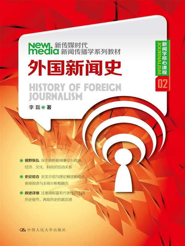 书名:《外国新闻史(新传媒时代新闻传播学系列教材·新闻学核心课程02)》 ISBN:978-7-300-17516-4 作者:李磊 定价:¥39.80 出版社:中国人民大学出版社 出版日期:2013-06-28 内容简介: 本书以封建集权时期、资本主义转型时期、资本主义市场竞争时期和社会主义时期典型化国家的新闻传播史发展脉络为经,以新闻媒介发展史为纬,采撷世界各国丰富的新闻历史资料,糅合相关国家独特的历史背景,选取宽广的社会史视野,详略得当、科学合理地介绍与分析了人类新闻传播史的一般性发展规律和各国特殊化发展模式。 本书史料丰实,叙述生动,分析深入,史论结合,是一部新闻传播学专业的简明版世界新闻史教科书,对新闻史相关领域的爱好者亦开卷有益。