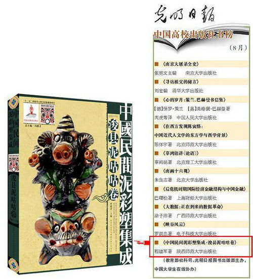 教育部与光明日报社共同主办的“中国高校出版社书榜”(8月)日前发榜(见8月26日《光明日报》第9版),陕西师范大学出版总社2013年1月出版的《中国民间泥彩塑集成?浚县泥咕咕卷》成为上榜10种图书之一,这是继《中国特色与世界眼光》登上首期“中国高校出版社书榜”后,出版总社连续第二次有图书上榜。