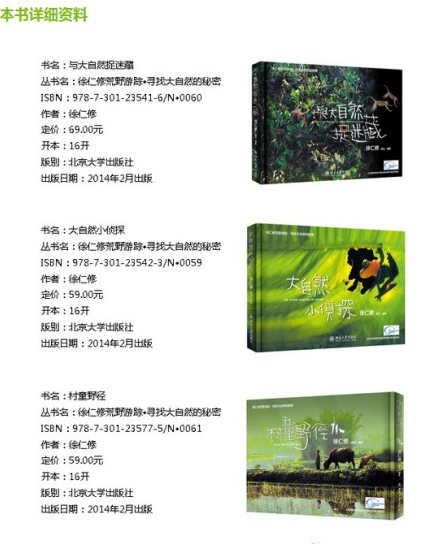 徐仁修是华人世界顶级的荒野探险家,在“徐仁修荒野游踪”丛书(徐仁修撰文、摄影 北京大学出版社)中,他用充满盎然生命力的影像,以童稚细微之心,写出了对大自然甜美与淡淡忧伤的感受,刻画出喜悦又惆怅的荒野乡愁。此书还是第一本结合文学与生态来展现台湾四季自然面貌的科普书,是诗歌、影像与哲思的完美结合,值得一读,更适宜亲子共读。(北京晚报)