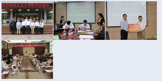 5月12日至5月17日,北京大学医学出版社王凤廷、陆银道新老社长携高教教材编辑室许立主任及相关人员会同北京大学出版社杨立范副总编、外语编辑部张冰主任一行前往贵州省考察相关医学院校教材建设情况,进行本(专)科(第3版)及英文影印教材的推广。在贵阳期间与贵阳医学院签署了战略合作协议,北京大学医学出版社与北大出版社分别赠送贵阳医学院图书馆价值50多万元和20多万元的书籍,并与学校党政领导及各院系主要负责人和参编“十二五”普通高等教育本科国家级规划教材的编委们就学校教材建设展开了座谈,广泛交流了教材编写、使用和建设中出现的问题和宝贵经验,尤其就“以器官为中心”的先进教学方法进行了讨论并达成共识,将积极筹划具有中国特色的以器官为中心的特色教材。会上王凤廷社长和陆银道顾问分别做了热情洋溢的讲话。