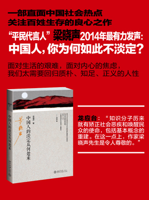 淡定二字,看似轻松,境界颇高。人生在世,难逃三个字:名、利、情。为其生,为其死,为其追求一辈子。修行或者修炼,最忌讳的就是执着。执着,就很难看淡,所以也就无法“淡”,更是不能“定”得下来。淡定,是内在心态修炼到一定程度所呈现出来的那种从容、优雅的感觉。《中国人的淡定从何处来》不仅是一部直面中国社会热点,关注百姓生存的良心之作,也是一部发现人生智慧、追寻淡定生活的指南书。在《当今中国青年阶层分析》中,虽然高额的房价使得许多青年在“啃老”之后,还沦落为房奴,但 “知识出身这一良好形象为心理的盾”,却让他们“抵挡住了贫富差距巨大的社会现实的猛烈击打,更在乎的是于当下是否活出了好滋味,好感觉”。高品质文化的守望让他们淡定地成为一群精神贵族。在《被两种力量拉扯长大的中国人》里,下岗的工人、种田的农民、买不起房的青年、为找工作发愁的学子、看不起病的家庭、没关系寸步难行的社会……让中国人郁闷地在网络中寻求发泄,但发泄完了,还得淡定地“复适应于现实的种种规则或潜规则”。《扫描中国女性》里,面对失业、住房紧张、大龄化、无技术、无学历等一系列现实困境,她们迷惘、彷徨,她们痛苦、失落,她们执着、追求……在看似混乱如棋局的城市里,却淡定地努力证明自己存在的意义。“淡定后面是问号而不是句号”。梁晓声说,“现在中国的问题很多,这些问题不能靠一个人想怎样活着的思想来解决,我想中国人如何活得更淡定取决于中国梦在什么时间实现到时间程度,当然我希望时间短一点,能使更多的人享受到成果,在这种情况下中国人可能活得淡定一些。”(中国经济时报)