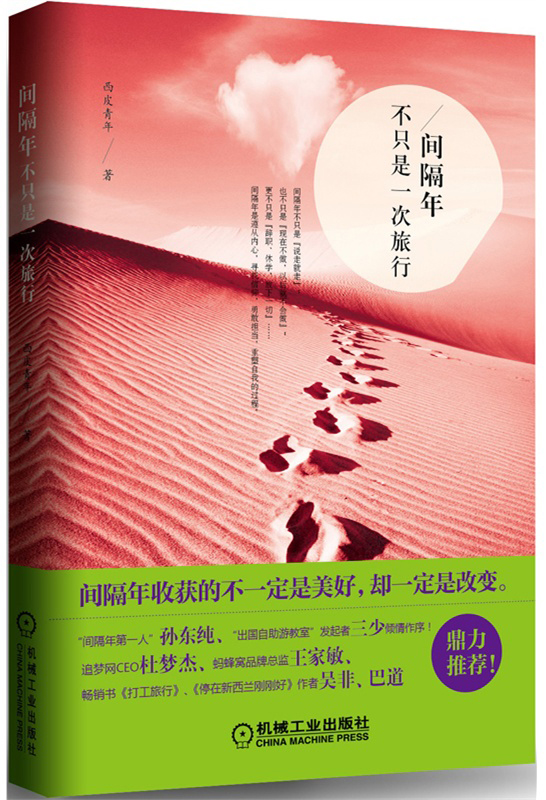那间隔年究竟是什么呢?正如西皮青年团队在这本书封面上写的:“间隔年是遵从内心,寻找信仰,勇敢担当,重塑自我的过程。”也许听起来有那么些玄乎,但最好的理解就在路上,在间隔年之中。“一百个人有一百种间隔年“没有人能告诉你间隔年究竟能得到什么,但我们一直想说,间隔年肯定比旅行得到的多得多。