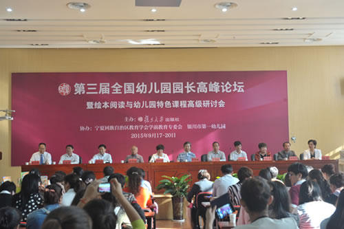 2015年9月17-20日,由复旦大学出版社学前教育分社主办,宁夏回族自治区教育学会学前教育专委会、银川市第一幼儿园协办的“第三届全国幼儿园园长高峰论坛暨绘本阅读与幼儿园特色课程高级研讨会”在银川市第一幼儿园拉开序幕。出席本届研讨会的领导和专家有银川市副市长钱秀梅,宁夏回族自治区教育厅基础教育处处长张可生,银川市教育局局长孙武平,著名儿童文学家梅子涵教授,华东师范大学武千嶂教授,上海体育学院陆大江教授,及来自全国各省市的教研员和园长200余人。会议由复旦大学出版社副总编兼学前教育分社社长张永彬教授主持,复旦大学出版社董事长王德耀教授代表主办方致辞。