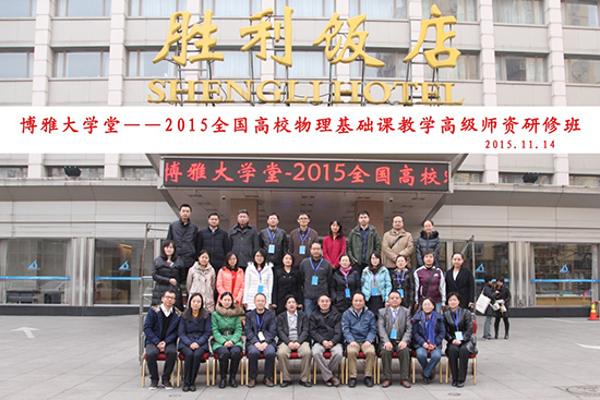 2015年11月14-15日,北京大学出版社联合北京大学物理学院在北京胜利宾馆成功举办了首届“博雅大学堂——2015全国高校物理基础课教学高级师资研修班”。研修班请到了北京大学物理学院舒幼生、王稼军、张酣、刘玉鑫教授做了精彩授课。来自北京大学、清华大学、武汉大学等著名高校的30多位一线教师参与了这次研修班,并在结束后获得了北京大学物理学院和北京大学出版社联合盖章的证书。 在简短而庄重的开幕式上,北京大学物理学院院长谢心澄教授以及北京大学出版社社长王明舟先后发言,对于参会老师表示了欢迎和感谢,并祝研修班获得圆满成功。 研修班的第一个报告由原北京大学物理系副系主任,现北大物理学院教授张酣老师给出。张老师报告的题目是《漫步物理的世界》。张老师结合多年教学经验,给与会的老师讲述了物理学发展历史和学科结构,以及目前的发展水平和对未来的展望。在讲述过程中还穿插着关于如何吸引学生认真听课、如何激发学生学习兴趣的教学心得。张老师的讲授结构宏大、引人入胜,受到了听课老师们的一致好评。