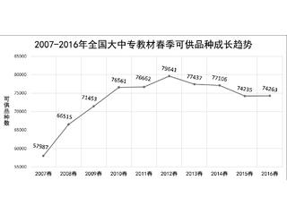 2016年春季全国大中专教材可供品种成长分析报告 图表一 2007-2016年全国大中专教材春季可供品种成长趋势□新华智库陈雪 2016年春季《全国大中专教学用书汇编》(简称《教目》)的纸质版和光盘版已于9月正式出版发行。本期报告将依据本季《教目》数据(不含《中央电大》分册及补充征订),对近年来春季教材可供品种的发展趋势及本季可供品种的出版特色进行分析总结,并根据国家未来的战略发展部署对眼下的几个热门和新兴产业的相关专业在本季的教材出版情况进行重点关注。 教材规模实现理性增长 纵观整个 2016年春季全国大中专教材可供品种,共计有141家出版社的74263种教材,与去年相比,同比涨幅仅为0.038%,浮动微弱。对比过往十年的春季可供品种数据(见图表一),从品种成长趋势来看,春季的教材可供品种在经过2007~2010年的井喷式增长后,在整个“十二五”期间(2011~2015)发展平稳。教材品种在2012年达到峰值,在此之后以稳中有降的走势进入理性发展的“慢车道”。综合来看,十年的春季教材可供品种数年均增长率为2.79%。