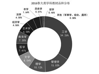 2016年春季全国大中专教材可供品种学科分析篇 □新华智库1937 陈雪 2016年春季教材可供品种的学科门类分布情况(见图表一),与前几年相比并没有大的变动,工学、管理学、理学的教材可供品种依然是占比前三位的学科,有34.26%的可供品种为工学教材。