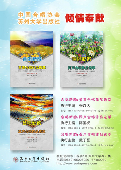 合唱事业蓬勃发展,而合唱新作品匮乏,这是我国目前合唱艺术发展的现状,为此,中国合唱协会通过出版合唱作品集、召开合唱作品创作研讨会、举办合唱作品音乐会等形式积极鼓励并推动合唱新作品的创作。由中国合唱协会选编、苏州大学出版社出版的《合唱新韵》系列曲集的出版正是中国合唱协会积极努力的结果。前任中国合唱协会理事长田玉斌先生担任本套丛书的总策划,他还参与了作品遴选工作,并亲自作序。