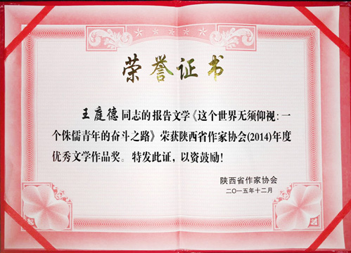 身高不足一米二的重度残疾作家王庭德,2013年出版了自传体长篇纪实文学作品《这个世界无须仰视》,引起广泛的社会讨论,继2014年获得陕西省慈善文艺作品二等奖、陕西省残疾人作家奋进文学奖一等奖之后,今天又获得了由陕西省作协评选的“年度优秀文学作品奖”,在十大获奖作品中报告文学仅此一部。近期王庭德接受了我社对他的特约访谈,讲述了他的创作经历,以及阅读和写作给他的命运带来的转变。他说:“是阅读和写作让我坚持走了过来,开阔了视野,走出了大山,改变了自己的命运。”