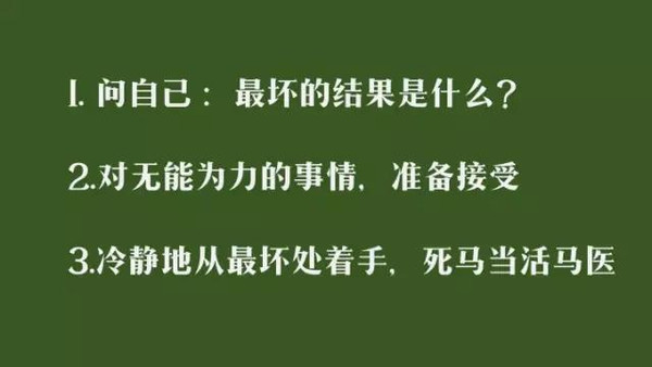 第二步:推测了找不到工作所导致的最坏结果后,设法让自己接受这个结果。如果毕业第一年找不到心仪工作,我可以先去小企业实习,积累工作经验,为自己积蓄能量,如果工资待遇比较不好,那也没什么,我还年轻,还有上升空间,我还有机会跳槽、晋升,人生不存在一次落后就永远落后的事情。我甚至可以去考研、学英语,目前找不到工作是我人生能够承受的情景。想到这些,我感到心里异常平静。