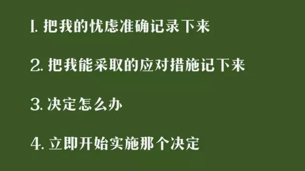 1. 把你的忧虑准确记录下来 2. 把你能采取的应对措施记下来 3. 决定怎么办 4. 立即开始实施那个决定