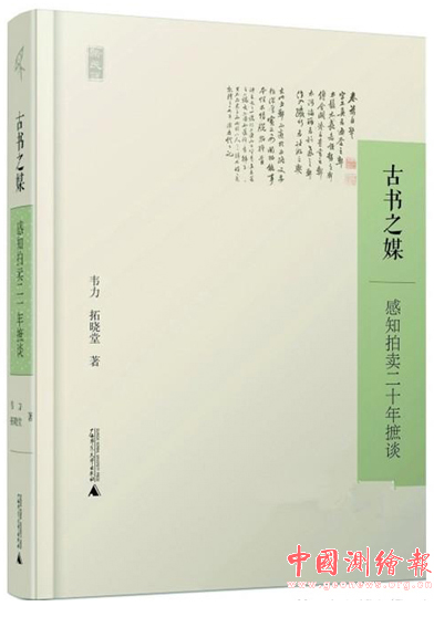 《古书之媒》一书是民间收藏家韦力先生和嘉德拍卖行古籍拍卖负责人拓晓堂的对话录, 2014年广西师范大学出版社出版。谈话的内容主要是梳理从1994年开始的中国古籍拍卖的历史过程。作者韦力在序言中说,古书进入拍场在中国还不到20年的时间,却彻底打破了中国千百年来形成的书籍流通格局,它给爱书的人带来了太多的便利。本书透过古籍拍卖的经历,让人感受到中国古籍的辉煌灿烂,中国文化的博大精深。