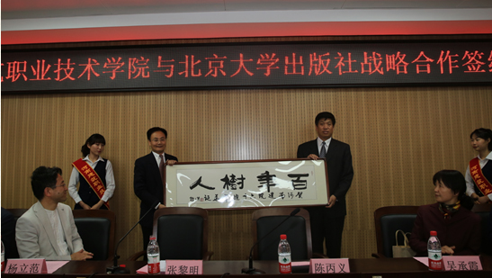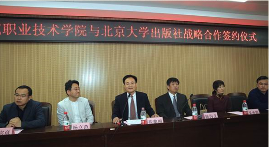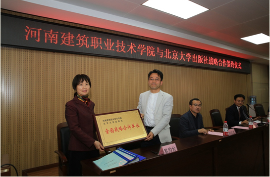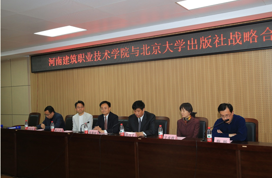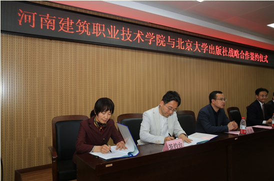 2016年4月20日,北京大学出版社与河南建筑职业技术学院在郑州举行了全面战略合作协议签字仪式,校社双方合作迈入新阶段。北大出版社总编辑张黎明、副总编辑杨立范、教学服务中心主任刘宗彦、第六事业部主任李虎,河南建筑职业技术学院院长陈丙义、副院长吴承霞、教务处处长梅杨等出席会议。签字仪式由河南建院教务处处长梅杨主持,河南建院教务处及各系部教师和学生代表参加了会议。