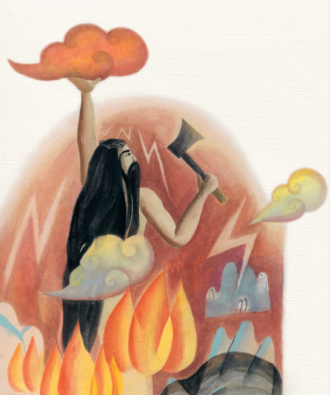 他的泪水撒向天空,变成夜里的万点繁星。汗珠洒向大地, 变成了滋润万物的绵绵细雨。他的头化作了东岳泰山,脚化作了西岳华山,左臂化作了南岳衡山,右臂化作了北岳恒山,腹部化作了中岳嵩山。他的肌肉变成了宽广肥沃的万顷良田,毛发变成了一碧千里的草原森林,血液变成了奔腾不息的江河湖海。他呼出的气体变成了清风和云雾,发出的声音变成了雷鸣,就连牙齿和骨骼,也变成了长埋地下的金银铜铁、玉石宝藏……