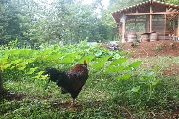 与大学生合力搭建的四平方米的小木屋,只花了五天的时间便完成了。二〇〇九年又扩建了四平方米,也只花了三天。这是我建造的第四栋屋子,对于准备工作或是坚固耐用的构造等知识都已经非常了解。地面放着还未完熟的堆肥,不过排泄物都是干燥的,没有臭味。鸡群在找寻食物时会翻动堆肥,所以这里也是个半自动的堆肥制造所。