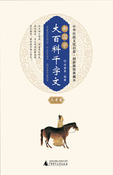 大百科。这本书介绍的内容以国学知识为主,但不限于此,还包括了诸如天文、地理、数学、物理、化学等自然科学知识,以及古文字学、美学、古典文学等人文科学知识,有着明显的知识百科的价值取向。本书还适当选取了一些哲学观点,以期引起读者探索的兴趣。 千字文。《新编千字文》是本书的主干内容,作者在创作时,充分借鉴古《千字文》的特点,全文通篇押韵,以求适合记诵。当然文中用的是新韵。这也是符合中华诗词学会关于“倡今知古、双轨并行”的用韵原则的。句式还力求对偶,以展现汉语的内在之美。用字无一重复,以求扩大知识容量。