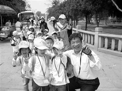 书中的一幅图片很吸引我,图中黄玉峰蹲在一群小朋友中间,做着胜利的手势,脸上是灿烂的笑容。这张照片是他特别喜欢的一幅,是他2008年在厦门集美学校访问时,路遇一群小朋友,于是便留下了这一美好瞬间。