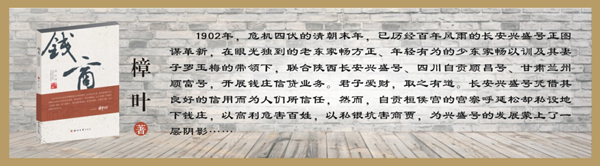 在我的印象中,樟叶的长篇小说写作,或在题材上写人所少写,或在内蕴上言人所未言,常有令人意外的拓辟与发见。他的《五福》,写近代陕西的辛亥革命,《晚春》写民国期间的西安围城,《石语》写景教碑的盗与护的交锋,都是他擅于开生面,走蹊径的一个个例证。新近推出的长篇新作《钱商》,又聚焦于晚清时期的陕西钱庄商人的货殖营生,写陕西渭南的畅氏家族在生财求利中的励精图治,励精图治中的与时俱进,由此描摹出了一幅晚晴时期陕西商人锐意进取的壮阔画卷。