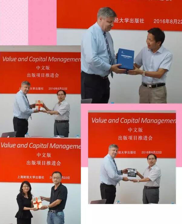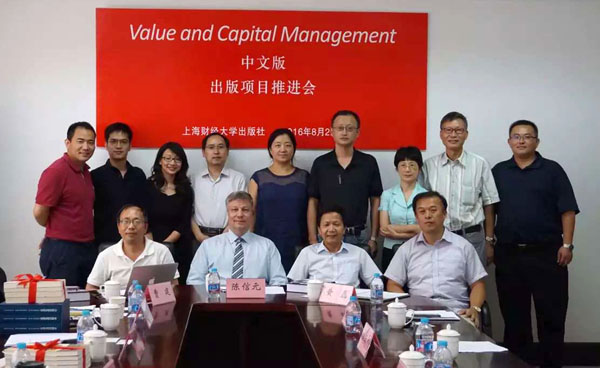 2016年8月22日,《Value and Capital Management》中文版出版推进会在上海财经大学出版社召开。上海财经大学副校长陈信元,全球最大的保险和资产管理集团之一——安联集团首席风险官、《Value and Capital Management》一书的作者托马斯·威尔逊(Thomas C. Wilson),安联中国风险管理部首席风险官张晋燕,上海财经大学出版社总编辑黄磊,本书部分译者和编辑团队出席了本次会议。会议由上海财经大学出版社社长曹建主持。