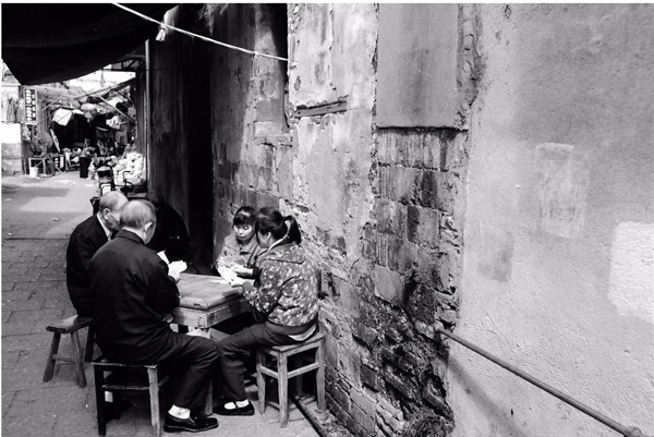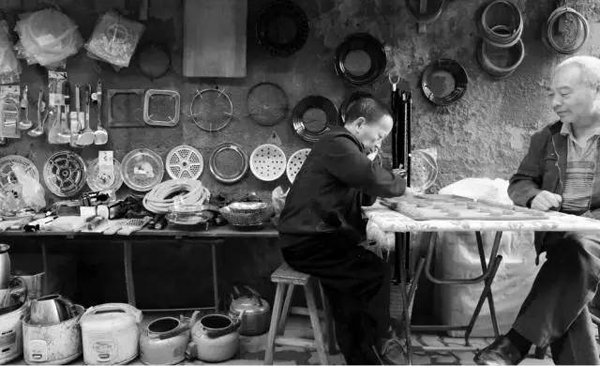 店主把铺子开到了一面墙上,墙上挂着他经营的商品:锅子、饭铲、汤勺、菜刨子、蒸屉、水壶、锅盖、水管,厨房的日常用具。店号招牌被省略了,用不着,陈列的商品胜过文字说明。店主不去照管他的商品,不在意买卖,而是喊了一个朋友,支一张小桌,下棋。