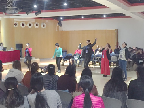 本次培训分为两堂:第一堂为“戏剧教育之定义”,林教授通过现场活动+理念阐释,带领与会老师们了解戏剧教育的本质;第二堂课为“戏剧教育之定位”,主要内容为戏剧教育课程的型态、戏剧教育的进阶课程。 本次工作坊为初级班,林教授与复旦大学出版社后期将继续举办中级培训班,帮助老师们进一步提升对戏剧教育的认识。
