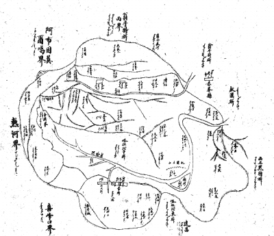所谓“蒙古游牧图”,大致制作于清代和民国时期,绘制者接受指令,“详查本旗游牧地”。因此,图片中大小地名、江河支流与河套、各方向之里数及边境之地,无所不包。形成行程差异的空间距离,不同地貌导致的交通条件,甚至作为交通标识的“路牌”等,都是“草原游牧图”必须记载的要素。乌云毕力格认为,这些图片给我们留下了内外蒙古地区数以千计的蒙古语地名的原始资料,记载了大量的寺庙和矿产、企业等文化与经济信息,经认真考察,足以为新的学术发现提供条件,其中涉及生态环境的信息非常珍贵,有关草原交通的资料应当引起交通史研究者的重视。