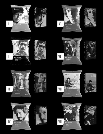 正当备受焦虑煎熬四处找人聊天的时候,我跟联邦走马工作室的恶鸟老师聊到了一起。他认为,我们既然要分册,不如索性拆它个十册八册,让它回归到短小精悍的规格,让它像一张唱片一样方便携带,像一本战斗手册一样可以任意摩挲,并建议把书装进薯片袋里。我们贪心地希望,一部诗集能像一袋薯片一样畅销和受欢迎——正如迪伦和他的歌,既经典又反经典,既畅销又反流行,从未被定义。接受薯片袋的建议还因为,首先,跟其他外包装相比,它轻便、简单又接地气得多。其次,它足够彰显美国气质。