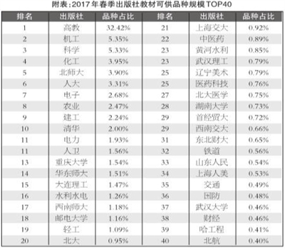 与2016春相比,有5家出版社在今年首次跻身TOP40:武汉理工大学出版社、中国铁道出版社、国防工业出版社、中国财政经济出版社、北京航空航天大学出版社,这些出版社2017年春季品种数的增幅分别达到175.12%、129.55%、69.95%、67.34%、17.20%。武汉理工社的优势教材方向为土建类、航海与海事类、自动化类等;铁道社的优势教材方向为经济管理类、计算机类、机电类等;国防社的优势教材方向为汽车类、民航运输类、机电类等;财经社的优势教材方向为财经和商贸类、经济管理类、财务会计类等;北航的优势教材方向为机械工程类、航空航天类、计算机类等。