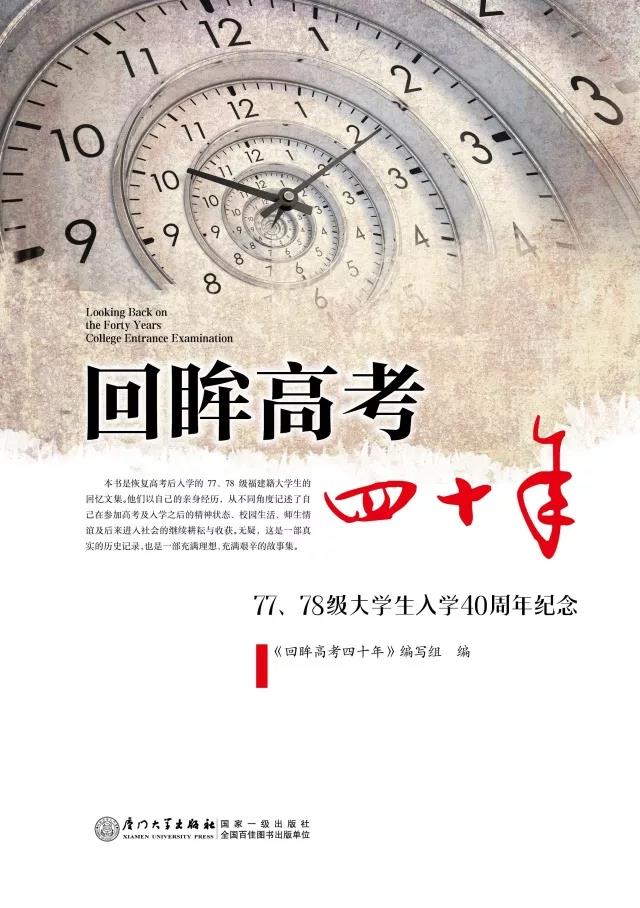 有这样一个机遇,在艰难的岁月中,开启梦想的大门,让你带着希望拾回遗落在山野的大学梦;有这样一段刻骨铭心,浸透着汗与泪,直至几十年后再回首,仍旧热泪盈眶。 1977 年,中断了十年的高考制度得以恢复,中国由此重新迎来了“尊重知识、尊重人才”的春天。高考的恢复,如一阵春风,温暖了经历了十年寒冬的有志青年;如一盏明灯,照亮了被琐碎、平庸覆盖的日常生活。 1978 年,恢复高考后的第一批大学生,他们踩着坚定的步伐,从各行各业走进了校园。他们中绝大多数来自田野、工厂,当梦想照进现实,把握住高考恢复带来的命运的转机。 纪念恢复高考暨 1977 级、1978级大学生入学四十周年之际,福建省当年亲历高考的 1977 级、1978 级学 生 们 选 编 了《回 眸 高 考 四 十 年——77、78 级大学生入学 40 周年纪念》(厦门大学出版社 2018年 1月出版)文集。在这本文集中,回忆了当年高考前后那段艰难曲折而又充满激情的岁月,记述了来之不易因而奋发努力的精彩的校园生活,以及他们和老师、同学之间的深厚情谊。