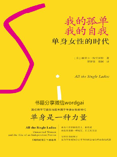 《我的孤单,我的自我:单身女性的时代》广西师范大学出版社2018年5月版 内容简介 《我的孤单,我的自我:单身女性的时代》是一部关于21世纪美国单身女性议题的纪实作品。作者特雷斯特聚焦这一群体,从近百个原始访谈中选取了约三十位女性的故事。当中有叱咤职场的女强人,有兼两份零工的单亲妈妈,有敢爱敢恨的女大学生。尽管她们的肤色、族裔多样,生活环境与教育背景不尽相同,但这些单身女性积极争取自身权益(选举权、堕胎权益),影响经济、文化与社会生活的方方面面。单身女性正在这个本不是为她们设计的世界里,逐渐占据一席之地,是时候开启一个“单身时代”了。
