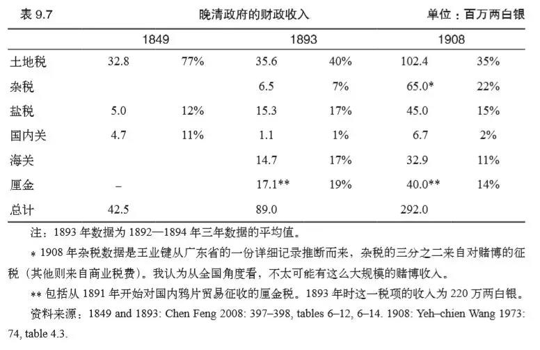 (1)对国内贸易征收厘金税(从1853年开始); (2)1861年设立帝国海关,向对外贸易征收关税。 太平天国运动失败之后,厘金和海关收入成为财政收入的重要来源,在1880—1890年代,这两大税种的收入占到了财政总收入的三分之一强。1849—1893年间,国家的财政总收入增长了超过一倍,而这几乎完全是各种新旧商业及消费税的贡献(见表9.7)。